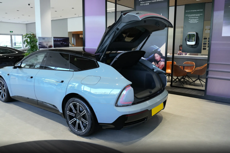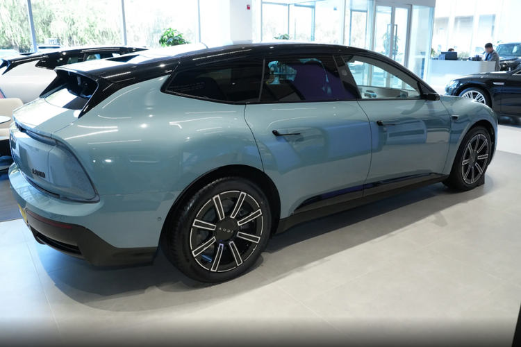 来到车身侧面,溜背线条从车顶滑到车尾,无框车门+隐藏门把手,轮廓干净利落,圆形轮拱19/20英寸轮毂(还能选曜黑款),低趴宽胎贴地感十足,运动范儿拉满,还把风阻压到0.252Cd,好看又实用。除此之外,车尾简约但有层次,贯穿式尾灯和前脸呼应,点亮辨识度拉满,再加悬浮尾翼、底部扩散器,运动感直接拉满,大掀背尾门还特实用,造型和实用一点不耽误。