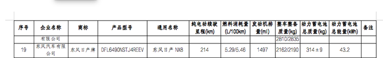 东风日产NX8基于天演架构打造而来,其中增程版本采用最大功率109千瓦的1.5T发动机,驱动电机最大功率195千瓦。据最新信息显示,东风日产NX8增程版支持匹配来自宁德时代的43.2千瓦时磷酸铁锂电池组,工信部纯电续航里程214公里。另外,早前申报信息显示东风日产NX8增程版还可搭载20.3千瓦时、21.1千瓦时、37.4千瓦时磷酸铁锂电池组,对应的工信部纯电续航里程分别为102公里、102公里、185公里。