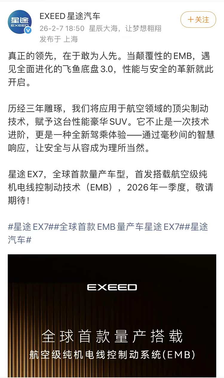 继申报信息公示后, 星途EX7(参数|询价)的更多产品亮点也持续得到释放。日前,星途汽车官方宣布,星途EX7将采用全面进化的飞鱼底盘3.0,首发搭载航空级纯机电线控制动技术(EMB)。根据规划,星途EX7将于2026年第一季度正式发布。