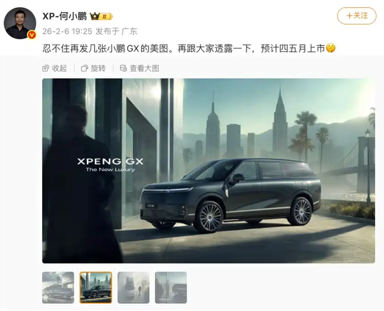 车家号·0浏览·2026-02-08 08:30 · 北京日前,小鹏汽车旗下全新车型GX的工信部申报图正式曝光。新车定位为“AI新豪华大六座旗舰SUV”,此次同步申报了纯电动与增程式混合动力两种版本。其中,增程版的纯电续航里程为320公里。