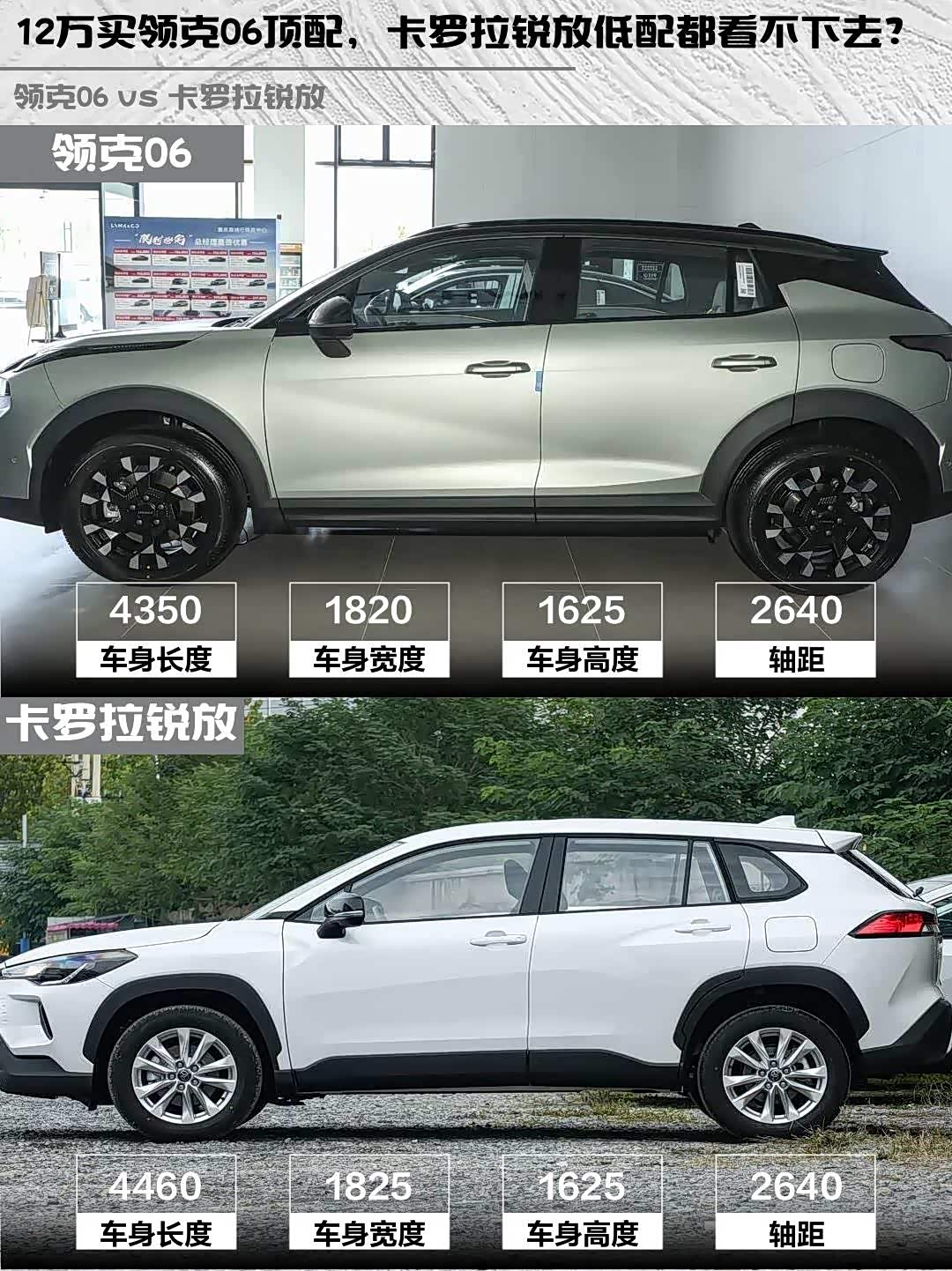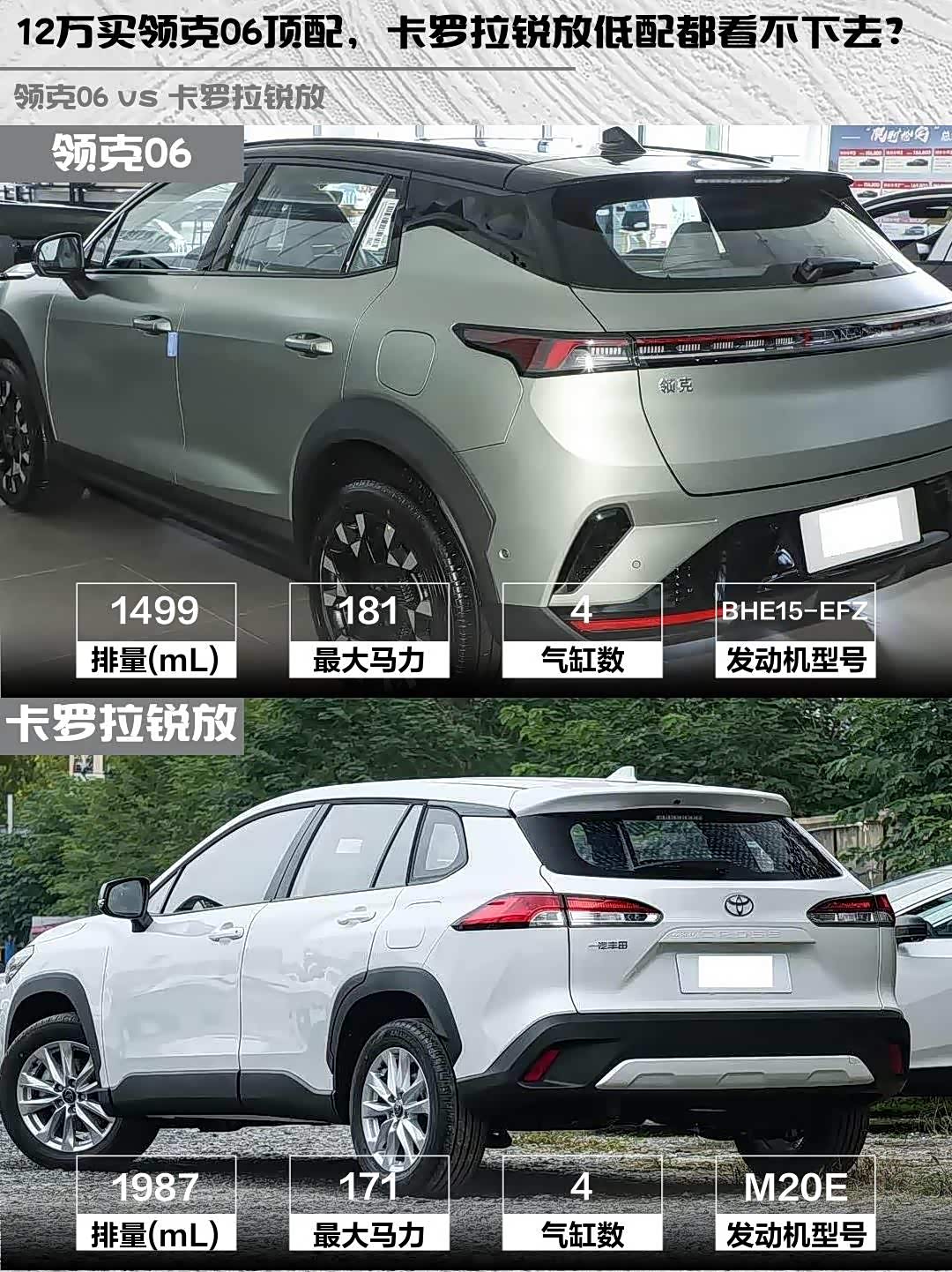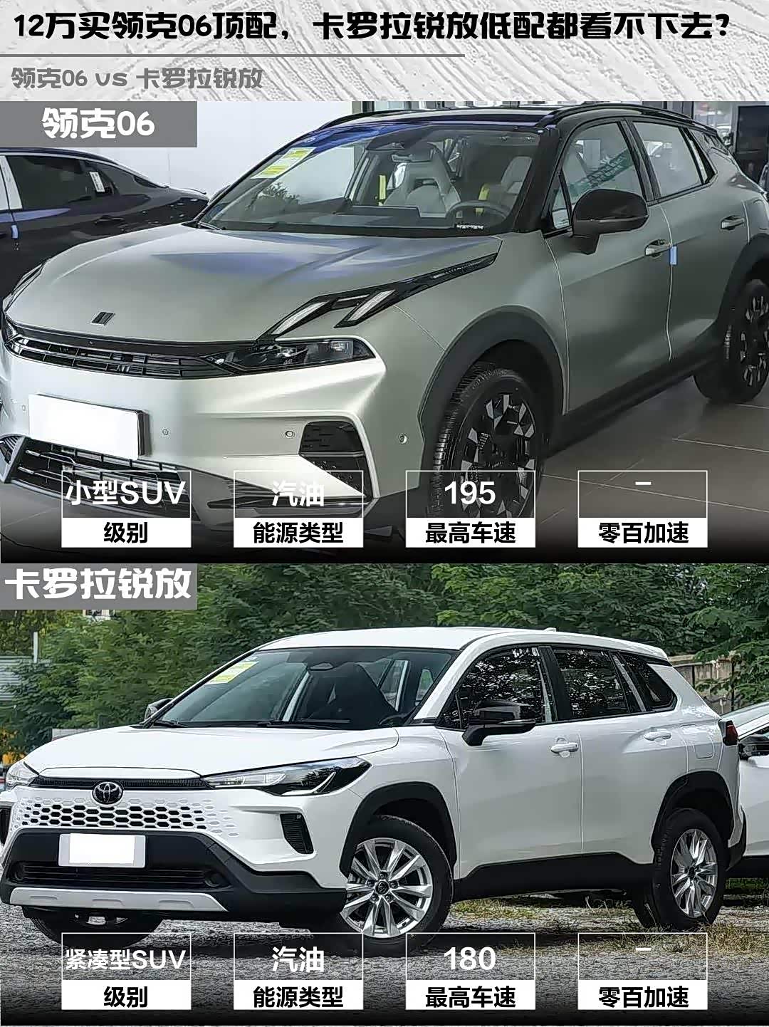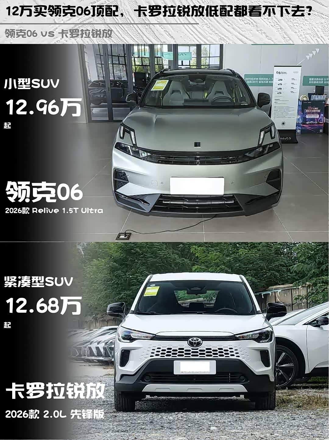 最近后台好多兄弟问12万预算选SUV,领克06 2026款 Relive 1.5T Ultra和 卡罗拉锐放(参数|询价)2026款 2.0L 先锋版怎么选?刚好上周陪朋友试驾了这两台车,直接上干货对比!🔥