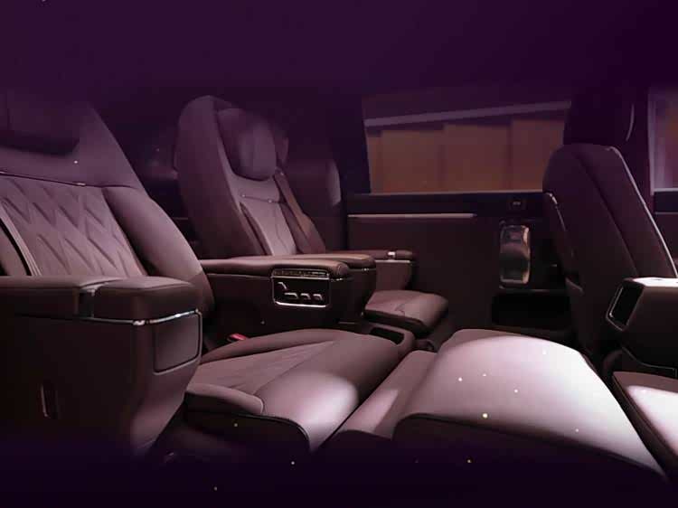更豪横的在于二排,二排双零重力座椅看着高大上,腿托、脚踏都有,且有着1.05米的超长支撑,座椅扶手内侧还提供了调节座椅的实体按键。值得一提的是,新车二排座椅可实现180度旋转,以此和第三排形成对座。另外,从一些细节不难看出,智界V9二排带有小桌板,提供了吸顶屏,当然像冰箱这些肯定都会有。