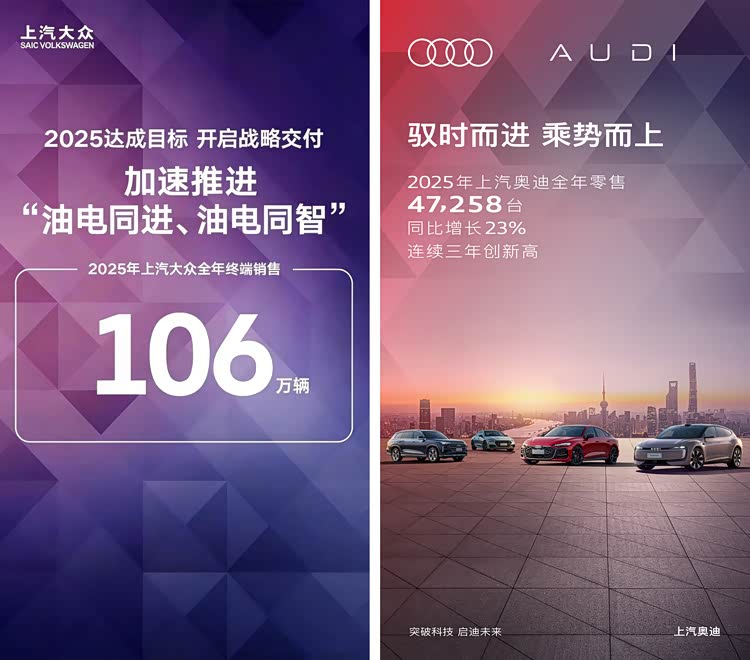 2025年的稳步前行,为2026年的全面发力蓄满了势能。这一年,将被定义为上汽大众的“战略全面交付年”。从第二季度起,企业将进入密集的产品投放期,涵盖增程、插混、纯电等多种动力形式的多款新能源车型将陆续登场。大众品牌将以“进取、可靠、贴心”的形象持续贴近主流市场,而上汽奥迪则强化“年轻、科技、豪华”的标签,双品牌预计将推出多达7款全新新能源车型。