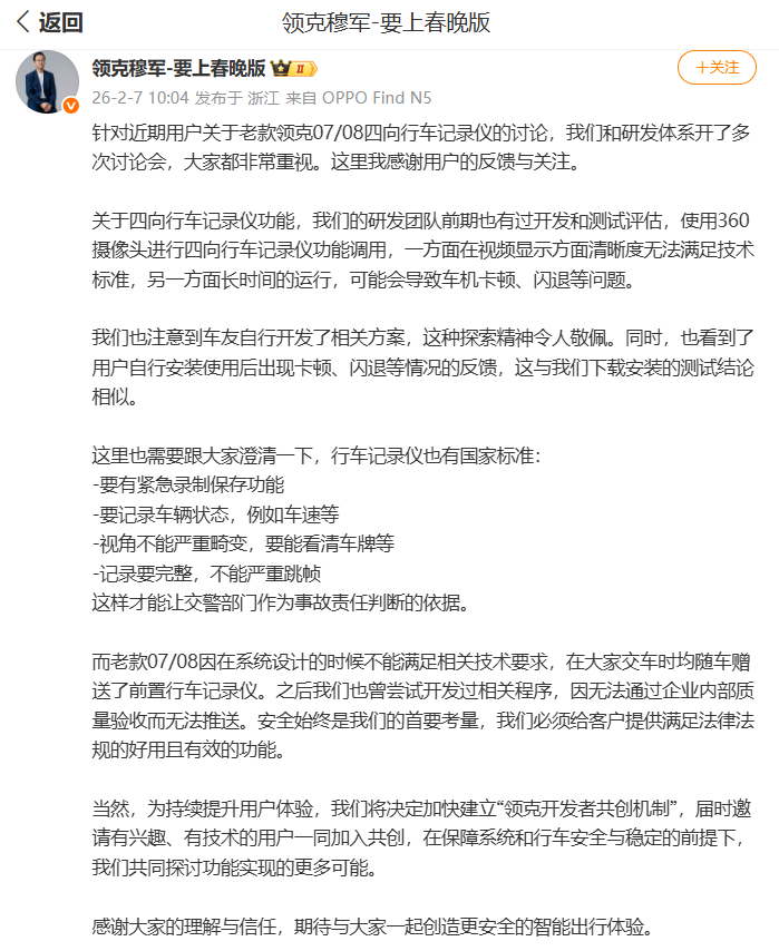 最后,本文涉及到的“老款领克07/08四向行车记录仪争议事件”,目前领克高管已经进行回应,相信领克会妥善解决相关问题,具体以官方回应为准。希望大家理性看待,不信谣、不传谣。