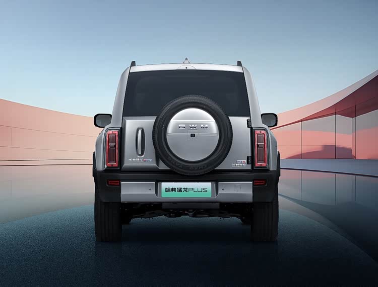 新车侧面侧窗熏黑处理、“HAVAL”标识+山形贴花增强辨识度,车顶行李架提升实用性。尾部配备 外挂式全尺寸备胎,配合竖状尾灯,与前脸形成呼应,强化硬派视觉语言。
