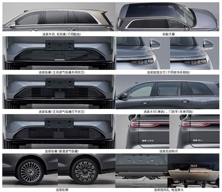 结合目前公布的官方图片和申报图片来看,魏牌V9X的外观设计很符合国人对于SUV的审美,整体风格大气、舒展,并兼具威武感。新车前脸采用封闭式设计,贯穿式环形灯带将两侧造型修车的大灯连接起来,形成一个整体,拉伸了视觉宽度;同时,支持流水迎宾效果的灯带和可发光品牌LOGO将科技感直接拉满。前包围中央配备主动闭合式进气格栅,下包围两侧集成智驾小蓝灯和转向灯。此外,车头顶部的激光雷达表明,它将搭载高阶驾驶辅助系统。
