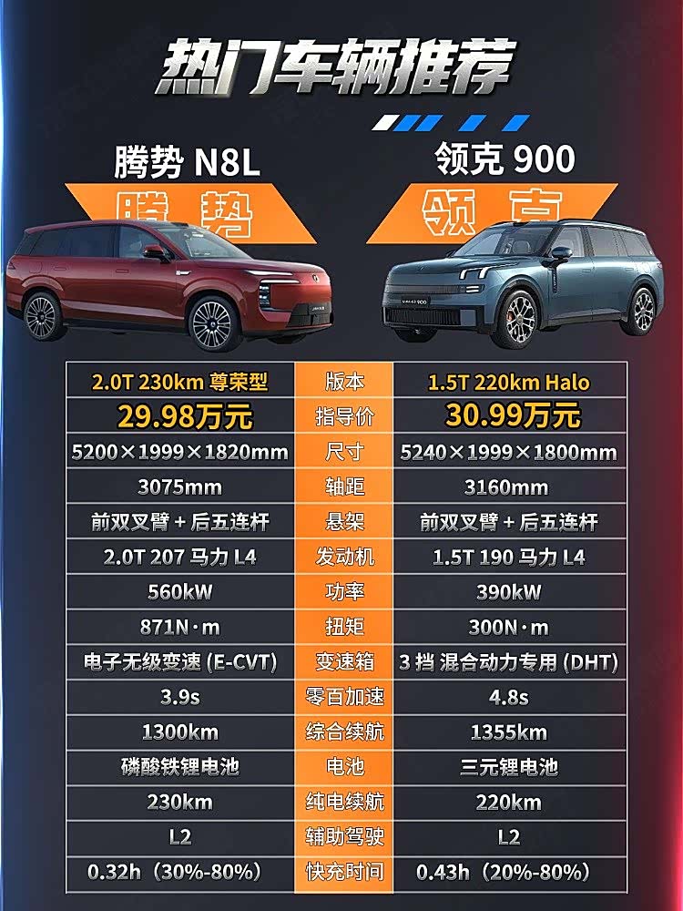 腾势N8L 2025款尊荣型售价为29.98万元,领克900 2025款1.5T Halo售价为30.99万元,两款车售价接近,均为大型SUV,品牌影响力方面也比较接近,那么哪一款车更值得入手呢?