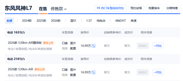 2月4日,东风乘用车推出L7 2026款,提供530km AIR精英版与530km AIR版,指导价均为16.99万元。两款车CLTC纯电续航均为530km,AIR精英版搭载61.24kWh磷酸铁锂电池,百公里耗电量13.5kWh;AIR版搭载62.36kWh电池,百公里耗电量12.9kWh。电池容量的差异对应不同的性能表现,AIR版可提供更强的动力储备与更快的加速,形成续航一致、动力可选的组合。
