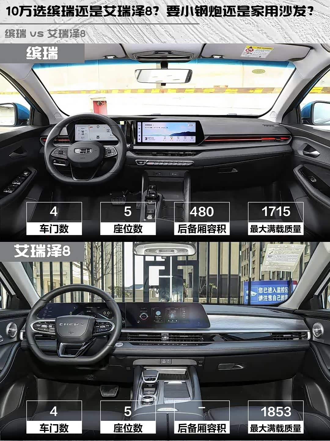 艾瑞泽8以4780mm车长和1843mm宽度碾压缤瑞,后排轻松翘二郎腿,520L后备箱能塞下整套露营装备🏕️。缤瑞的溜背造型牺牲了些后排头部空间,但480L后备箱日常也够用。隔音方面两车半斤八两,高速上风噪都挺明显,但艾瑞泽8的座椅填充物更厚实,长途乘坐舒适性加分。