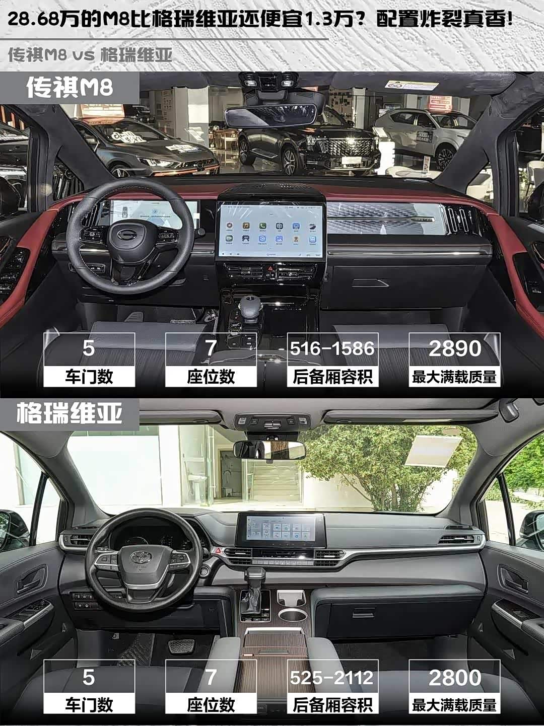 最后说价格:传祺M8超级混动版28.68万比格瑞维亚舒适版便宜1.3万,但多了电动尾门、更大轮毂、全景天窗等配置。要商务豪华选传祺M8,纯家用省油选格瑞维亚,你们会怎么选?