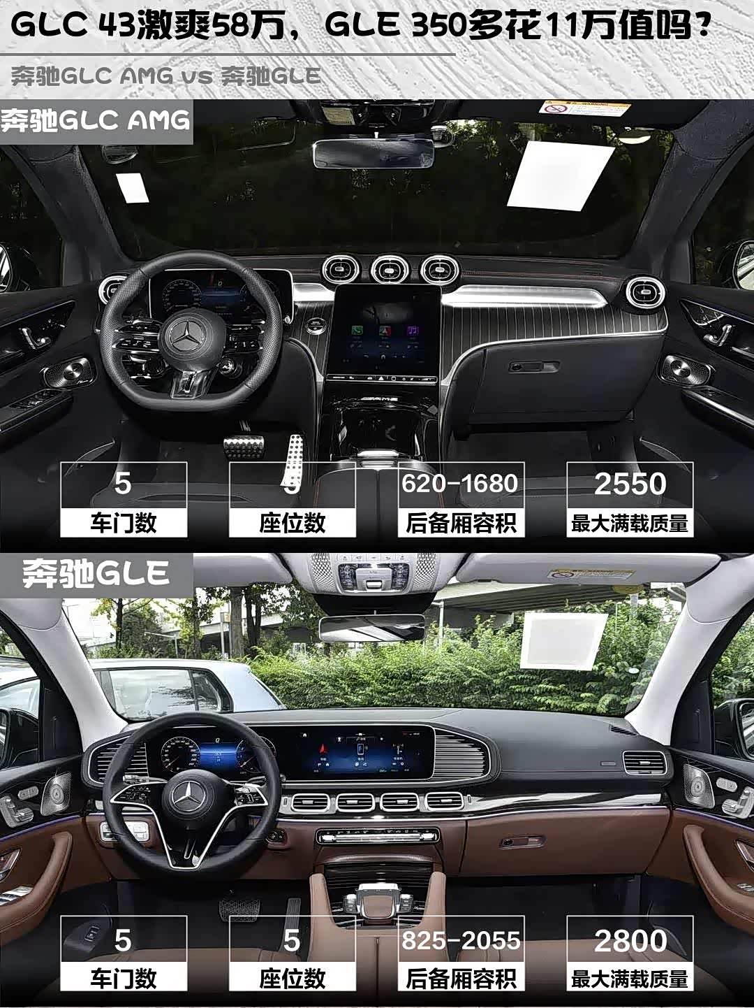最后给个建议:单身或者小两口选GLC 43,经常全家出行选GLE 350。两台车停在一起时,GLC 43的AMG套件确实更吸睛,但GLE的游艇式车身线条更有旗舰风范。你们会怎么选呢?