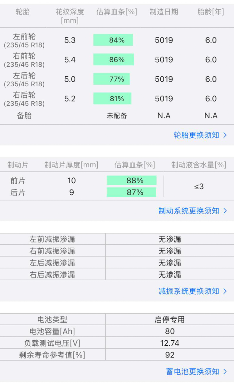 它的耗材部分,刹车片余量近九成,四条轮胎余量八成左右,到手没啥额外支出的地方。但胎龄已有6年,这个可以按需进行更换。