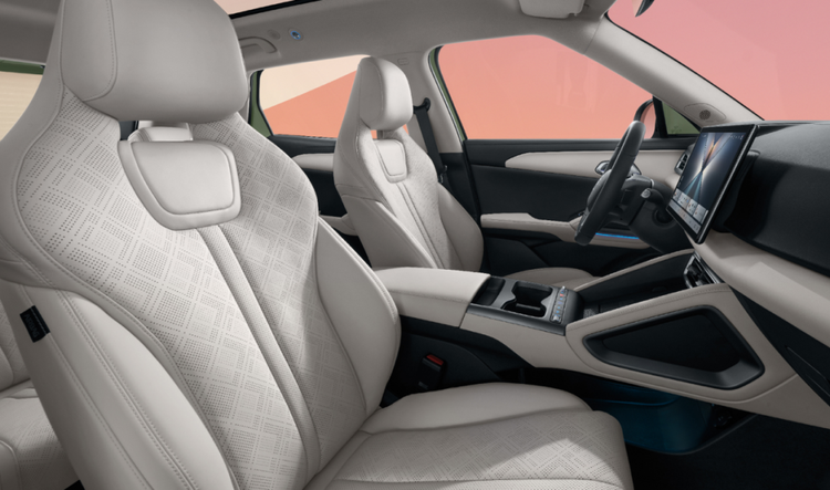这款车内饰设计延续“纯净美学”理念,母婴级健康座舱是大“卖点”,色彩搭配温馨,座椅选用 SPA 级亲肤材质,主驾支持 6 向电动调节,副驾座椅可向前 90 度折叠成脚踏。