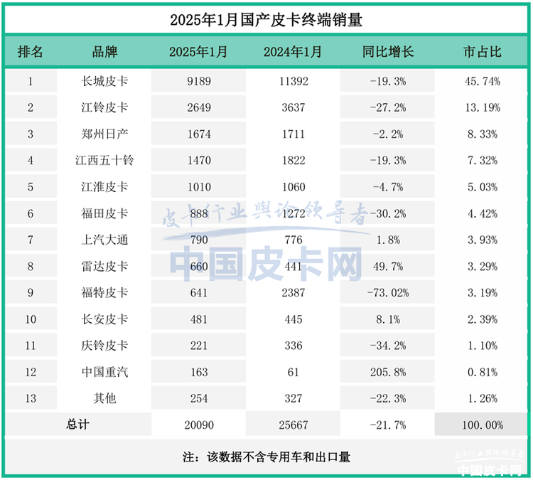 首先,让我们一起来回顾一下2025年中国皮卡市场的销量表现。受限于春节假期以及国内大环境的影响,2025年中国皮卡的“开篇”十分不理想。2025年1月,国产皮卡终端销量为20090辆,同比下降21.7%,销量排名前六的皮卡企业均同比下滑,最大降幅超过了30%。