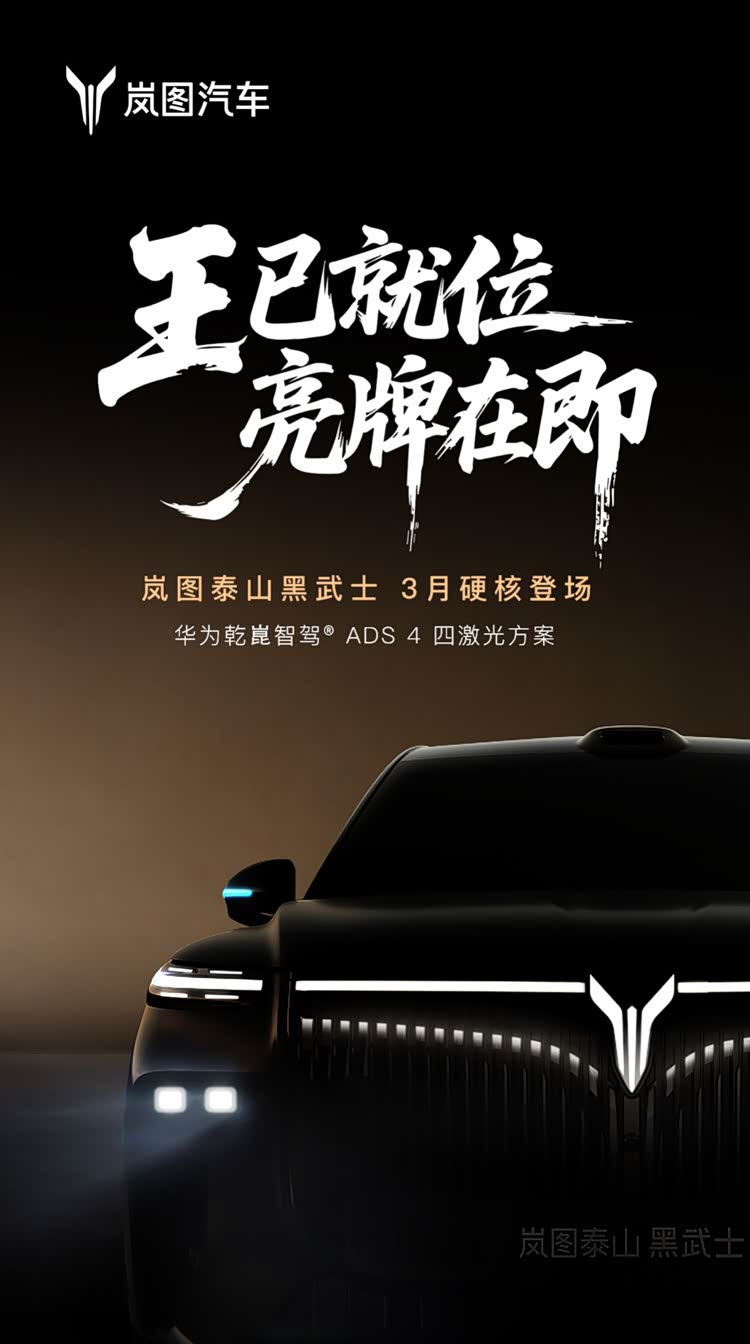 车家号·0浏览·2026-02-09 11:22 · 北京2月9日,岚图汽车官方社交平台发布视频,正式宣布 岚图泰山(参数|询价)黑武士版将于今年3月登场,采用限定发售策略。