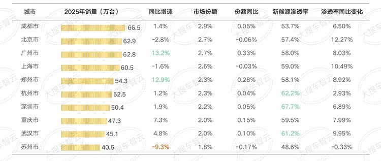 - 成都以66.5万台居首,同比微增1.4%;广州、郑州销量同比分别上涨13.2%、12.9%为增速最高;