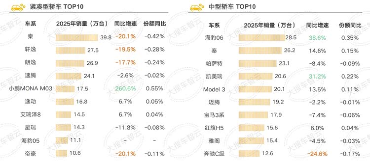 - 紧凑型轿车:秦以39.8万台稳居榜首,但同比下降20.1%,市场份额失守0.42%;小鹏MONA M03以260.6%爆发式增长强势突围,市场份额同比上涨0.55%,跻身紧凑型轿车TOP5行列。