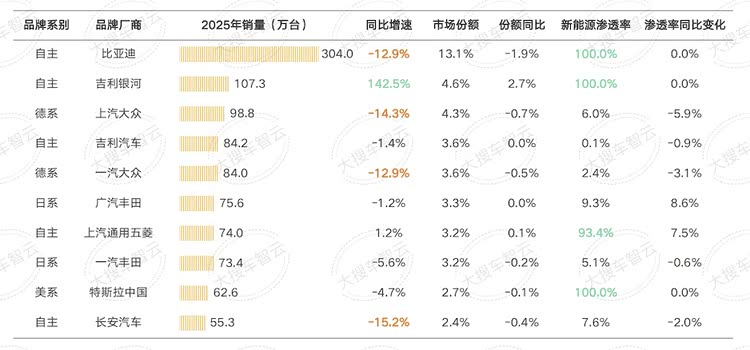 3、品牌厂商层面,比亚迪以304万台稳居榜首,吉利银河同比增长142.5%成为年度黑马。