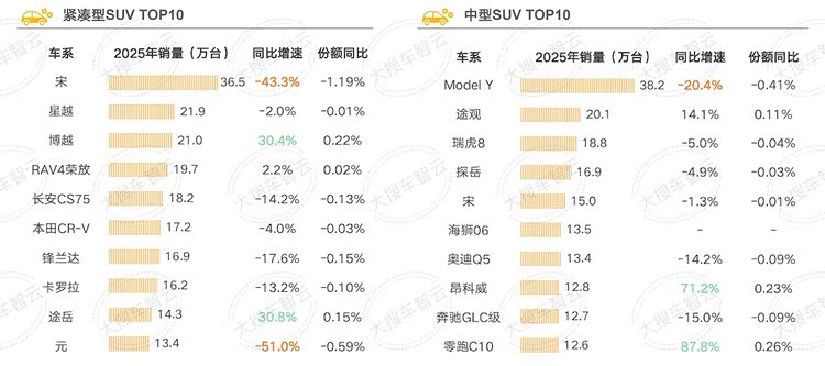 - 中型SUV:Model Y以38.2万台稳居榜首,但同比下降20.4%,市场份额失守0.41%;海狮06首次上榜取得13.5万台销量,市场份额达0.58%;昂科威、零跑C10同比分别上涨71.2%、87.8%,表现亮眼。