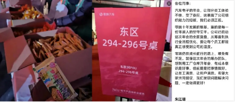 今年1月底,零跑在湖州工厂仓库办了场年会。没暖气、没座位、连厕所都紧张,3000名员工蹲着吃泡面。公司后来解释说是“响应降本增效”,还补发了iPhone和冷盘菜,但舆论已经炸了。