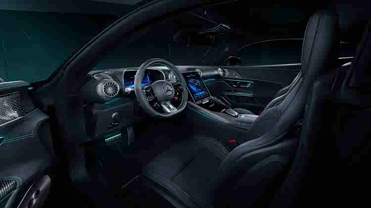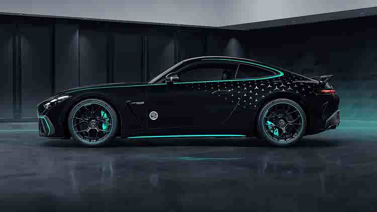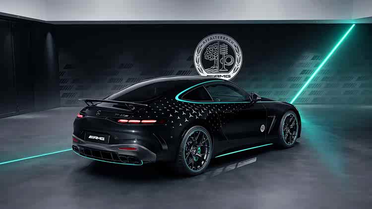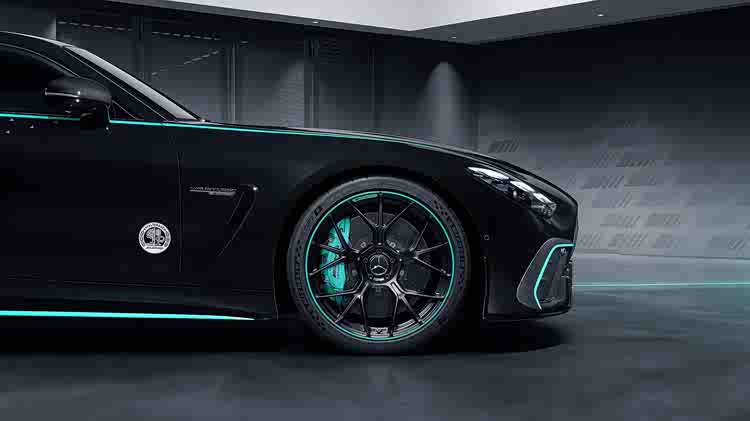 这款特别车型的基础色为名为“黑曜石黑”的金属漆。随后,从前唇到扩散器,手工涂装了银色的梅赛德斯星徽和大量青绿色装饰条。这种醒目的对比色由梅赛德斯长期主赞助商Petronas加入设计。就像他的F1赛车一样,大量梅赛德斯星徽点缀在车身上。