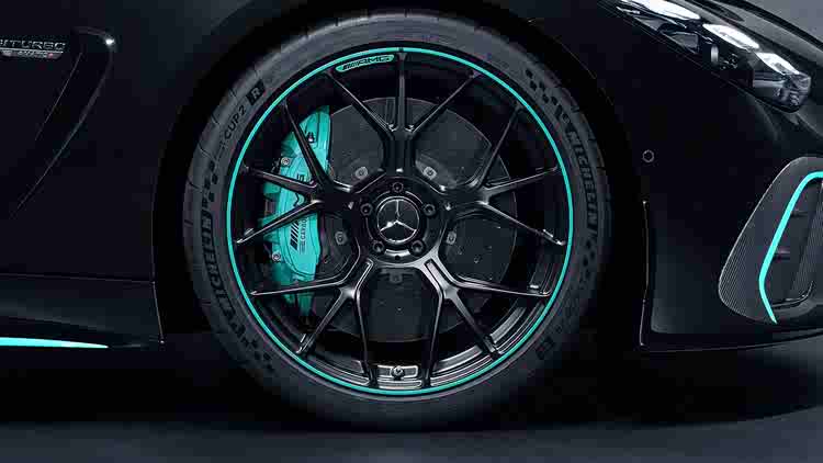 如果基米·安东内利想要做些什么,他可以直接开着这台新车上赛道。21英寸锻造轮毂(同样带有青绿色点缀)搭配米其林Sport Cup 2R轮胎。直径420毫米的碳纤维刹车盘确保合适的制动性能,车身上的空气动力学套件同样采用碳纤维材质。