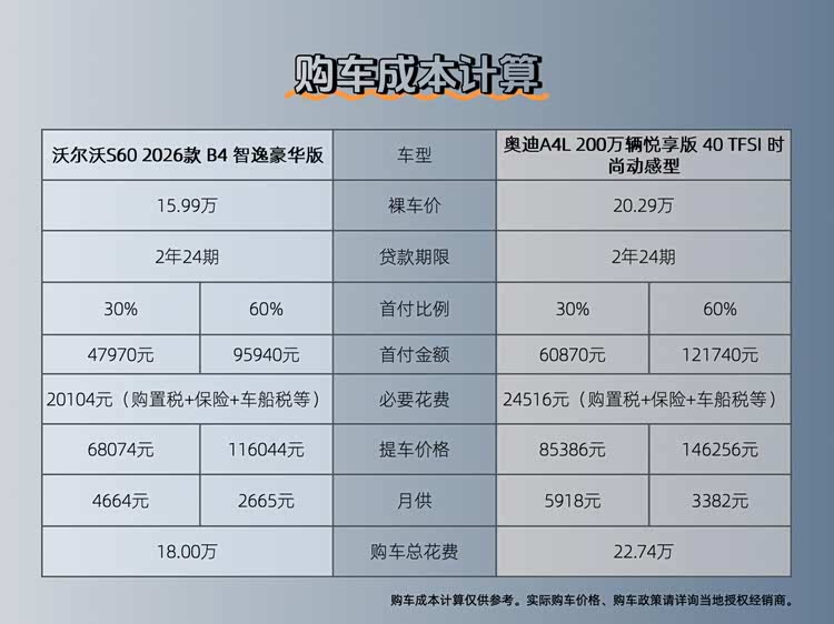 这个价格有多香?单单看还没有概念,我们来对比同级车型就知道了。就以奥迪A4L为例,现阶段奥迪 A4L入门版终端裸车价约20.3万,若选择2年0息金融方案,首付30%需支付6.08万,叠加购置税、保险等各项杂费后,提车门槛约8.5万,后续每月还款5900多元;若提高首付至60%,首付款约12.1万,算上杂费后提车需14.6 万左右,月供则为3300多元。两相比较就能明显看出,沃尔沃S60的购车与还款压力都轻松不少。(本文内展示的购车成本计算仅供参考。实际购车价格、购车政策请详询当地授权经销商)