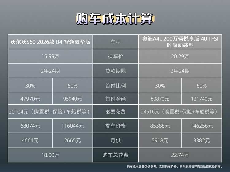 就拿奥迪A4L来说,这款车入门版当前终端裸车价约20.3万,同样是2年0息方案,首付30%约6.08万,加上各种杂费,提车仍需准备8.5万左右,后续每月还款约5900元;若想把月供控制在3300元上下,首付比例需提至60%、约12.1万,叠加各类购车杂费,提车时要一次性支付14.6万。一对比就知道,入手沃尔沃 S60,不管是提车门槛还是月供压力,都要轻松太多。(本文内展示的购车成本计算仅供参考。实际购车价格、购车政策请详询当地授权经销商)