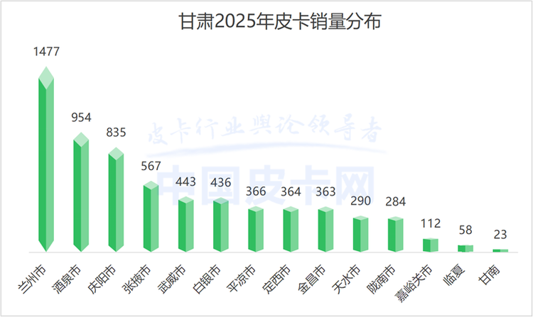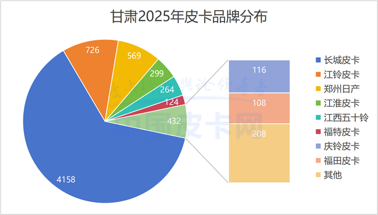 甘肃市场2025年皮卡售出6572辆,其中,动力类型选择非常集中,柴油皮卡占据绝对主流,占比84.2%,这与甘肃地广人稀、多山区地形以及用户对车辆可靠性的高要求密切相关。汽油车占比仅为14.8%,新能源产品在这里并不受欢迎,市场份额远低于全国均值。长城皮卡在该省展现出极强的统治力,市占率高达63.3%。