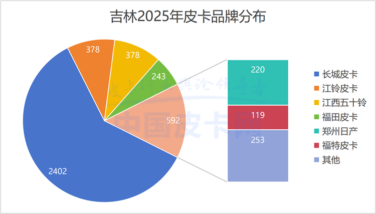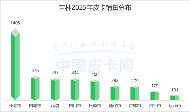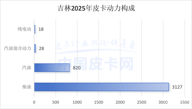 吉林市场2025年销量为3993辆,是东北地区重要的皮卡市场。省会长春市是核心消费区域,销量占比超过35%,吉林市和延边州紧随其后,共同构成了省内销量的主力。动力类型上,柴油皮卡占比高达78.3%,新能源占比仍处于起步阶段。品牌方面,长城皮卡以60.2%的绝对优势领跑,江铃皮卡和江西五十铃凭借在柴油动力领域的传统优势,分列二、三位,市场格局相对集中。