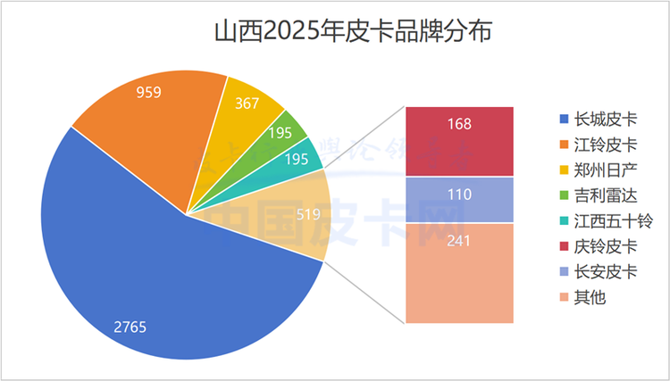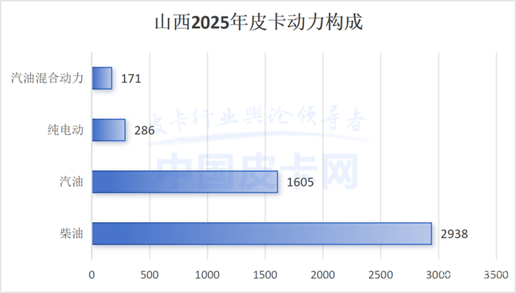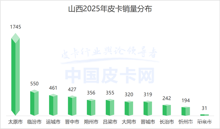 山西2025年皮卡销量为5000辆,省会太原遥遥领先。动力类型以柴油为主,占比62.4%,汽油车占比35.1%。新能源占比2.5%仍有较大发展空间。长城皮卡以55.3%的市占率占据领先地位,江铃皮卡同样畅销。
