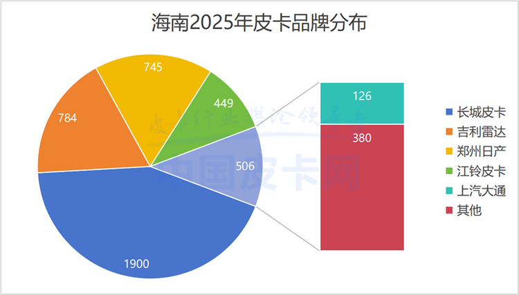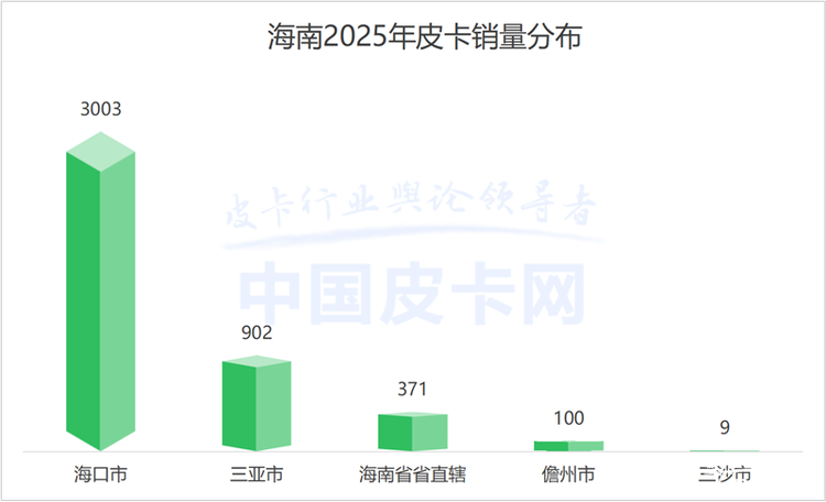 海南是全国首个提出2030年禁售燃油车的省份,动力类型上,在强有力的政策推动下,纯电动皮卡占比已快速提升至19.8%,为全国最高。柴油和汽油皮卡占比分别为42.1%和38.1%。省会海口市销量占比高达68.5%,长城皮卡和吉利雷达两大品牌位居前二,新能源品牌已占据重要地位。