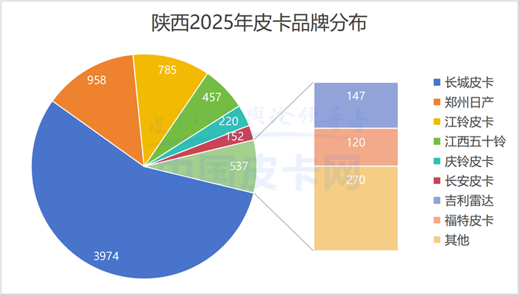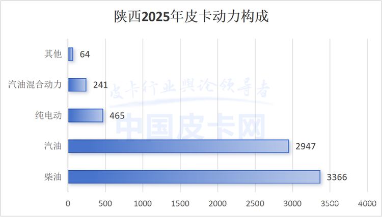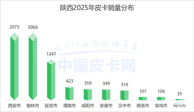 陕西市场2025年皮卡销量为7083辆,西安市与能源重镇榆林市构成了省内最重要的两大市场。动力类型分布极具特色,柴油皮卡占比47.5%,而汽油皮卡占比高达41.6%,远高于北方省份平均水平,这反映出西安等城市的乘用化消费趋势与榆林等地的工具车需求并存。新能源占比为10.9%。长城皮卡在此拥有绝对优势,市占率达到56.1%,郑州日产、江铃的销量表现不相上下。