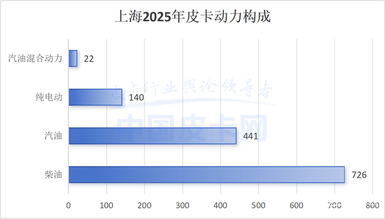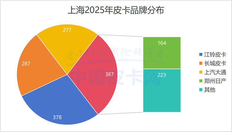 上海作为国际大都市,2025年皮卡市场规模较小,为1329辆。受限于严格的通行政策,皮卡消费极具局限性,主要用户为拥有特定路权的企业、位于郊区的工商户以及极少数追求个性的玩家。动力类型因此呈现多元化特征:由于路权限制和环保导向,新能源皮卡占比15.2%,显著高于许多大型城市;汽油车占比51.3%,柴油车占比33.5%。品牌分布较为分散,江铃皮卡、长城皮卡、上汽大通份额相对领先,呈现出多元化竞争的特征。