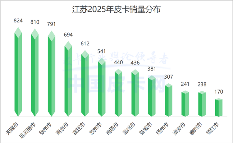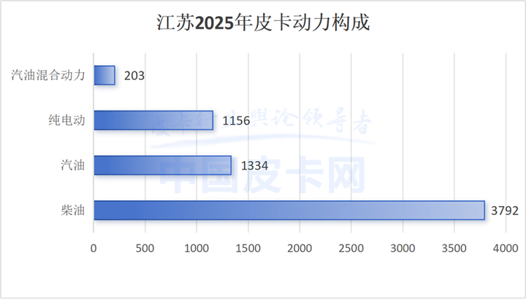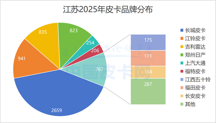 作为经济强省,江苏全年皮卡销量仅6485辆,与庞大的经济体量看似不甚匹配。动力类型是最大亮点,江苏新能源化进程显著领先全国,纯电动与混合动力皮卡合计占比已达21.0%,远高于全国平均水平。柴油皮卡占比为45.3%,汽油皮卡占比33.7%。品牌格局分散,长城皮卡虽位居第一,但市占率为41.0%,吉利雷达等新能源品牌表现强势,上汽大通同样进入前五,这与两大品牌的大本营位于江浙沪内有所关系。