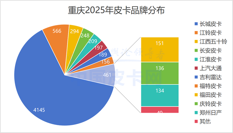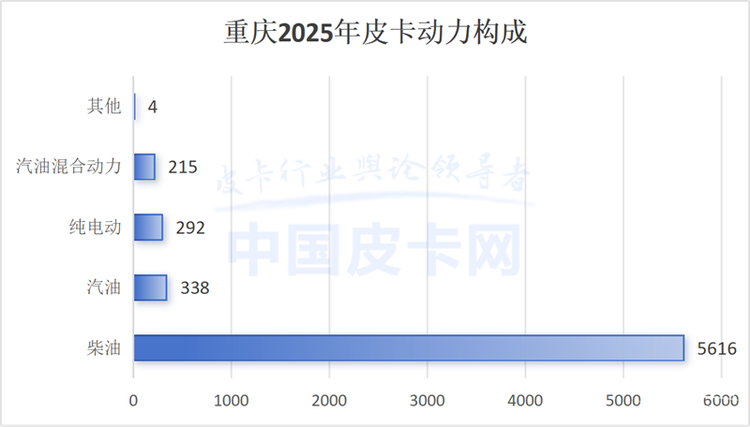 2025年,重庆全域销量为6465辆。动力类型高度集中于柴油动力,占比高达86.9%,这与当地的山城地形和用户对车辆爬坡能力的需求紧密相关。汽油车占比12.5%。长城皮卡是最大的赢家,市场份额高达64.1%,江铃系产品紧随其后。