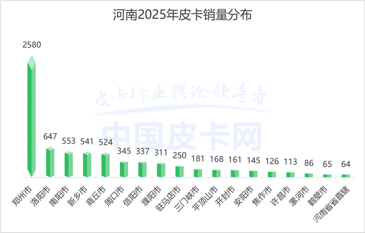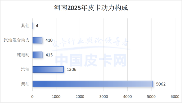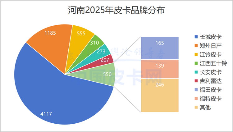 河南是早期皮卡解禁试点省份,2025年销量7197辆。省会郑州市表现突出,占据了全省销量的35.8%。动力类型方面,河南作为农业和交通大省,柴油皮卡仍是主力,占比65.3%,汽油皮卡占比32.5%,新能源车型刚刚起步,占比2.2%。河南是长城皮卡的优势市场,市占率高达57.2%,本土企业郑州日产稳居第二,江铃和江西五十铃也在这里占据一席之地。