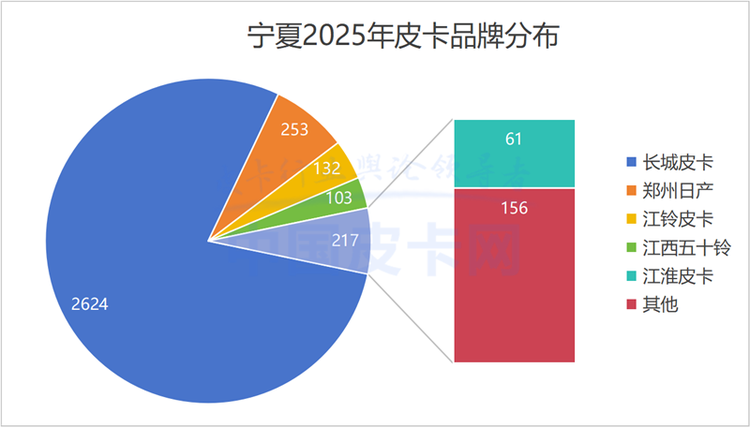 宁夏市场2025年销量为3329辆,市场规模虽小但特点鲜明。首府银川市是绝对的销售中心,贡献了全区近一半的销量,吴忠市和中卫市为次要市场。该地区用户多将皮卡用于农业、畜牧业及小型货运,对车辆的承载能力和皮实耐用的特性非常看重。动力类型高度依赖柴油,占比高达81.5%。品牌方面,长城皮卡的领先优势极为明显,市占率高达78.8%,几乎形成垄断态势;郑州日产和江铃皮卡占据剩余的主要份额,其他品牌难以切入。