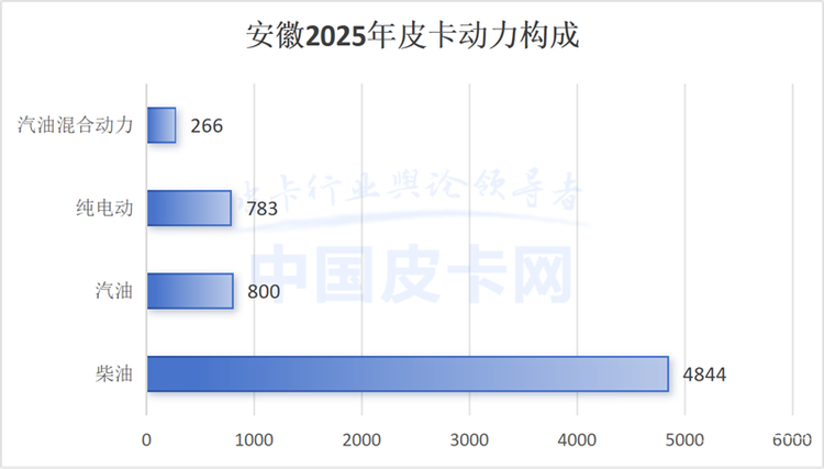 2025年,安徽皮卡市场销量为6693辆。省内区域分布与河南非常相似,省会合肥市是最大的消费市场,其余城市销量分布均匀。动力类型上,安徽市场相对均衡,柴油皮卡占比58.8%,汽油皮卡占比38.5%,新能源占比2.7%。品牌方面,长城皮卡以46.8%的份额领先,本土品牌江淮皮卡在故乡市场保有重要地位,进入了前五名。