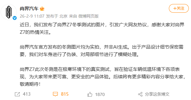 尚界汽车辟谣Z7冬测图片AI生成:均为实拍