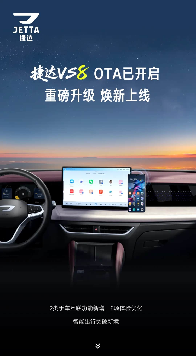 2月9日,捷达官方宣布VS8车型迎来新一轮OTA推送。本次升级的核心看点在于新增两项手机互联功能,同时针对6个具体场景进行体验层面的调整。