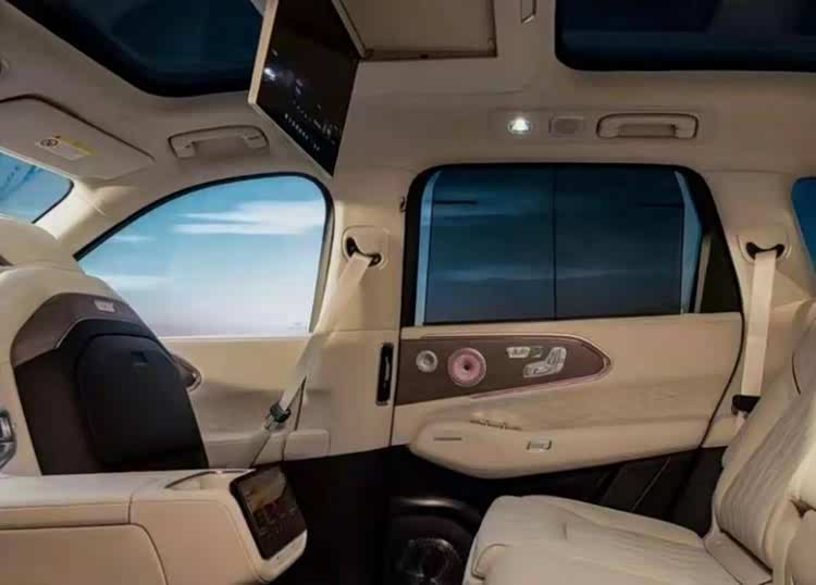 更有看点的是后排空间,右侧配备零重力座椅,打开零重力模式前排座椅可自动前翻腾出空间,五座车布置零重力座椅确实少见。另外,车顶还提供吸顶屏,屏幕位于前后天幕之间,布置的也很巧妙。另外,地台处还有一个屏幕,控制后排各种硬件功能的。后排不仅有隐私玻璃,还有电动遮阳帘。配置上,多色氛围灯、座椅的通风加热按摩、车载冰箱以及多喇叭的高级音响,应该都不会缺席。