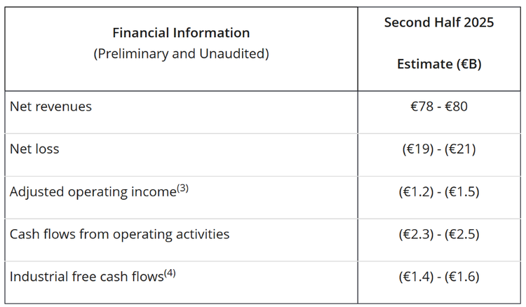 根据Stellantis集团提前公布的2025年第四季度数据,预计2025年下半年亏损金额达190亿至210亿欧元(约合人民币1561亿元至1725亿元)。