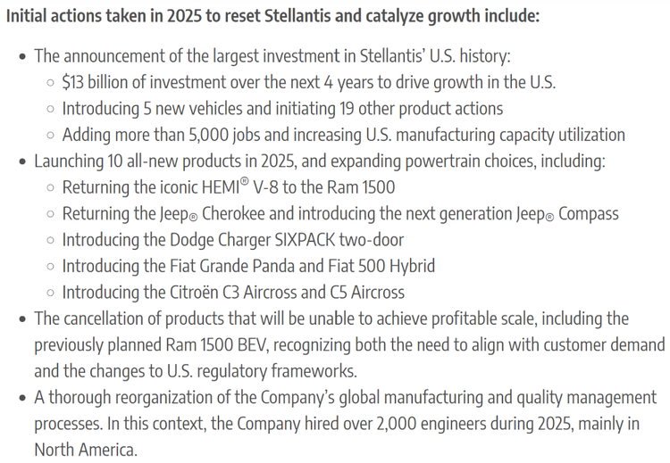 同时,Stellantis在2025年已开始采取行动,主要是调整产品计划和产品组合以符合市场需求。目前Stellantis采取的行动包括进行Stellantis美国历史上最大规模的投资,将在未来4年投资130亿美元(约合人民币900亿元),同时推出5款新车型。