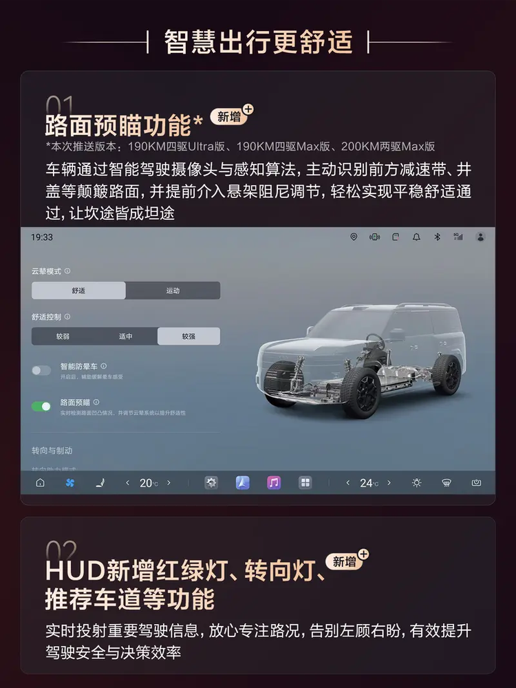 底盘和显示系统的优化偏向体验细节。新增的路面预瞄功能通过前置摄像头识别前方路面起伏,提前调整悬架阻尼参数。HUD抬头显示增加了红绿灯倒计时、转向灯闪烁提示和推荐车道箭头,信息密度有所提升但布局经过重新排布。其他调整还包括服务区短暂下电后自动恢复导航进度、冰箱触控面板的防误触逻辑、语音控制覆盖范围的扩展等。