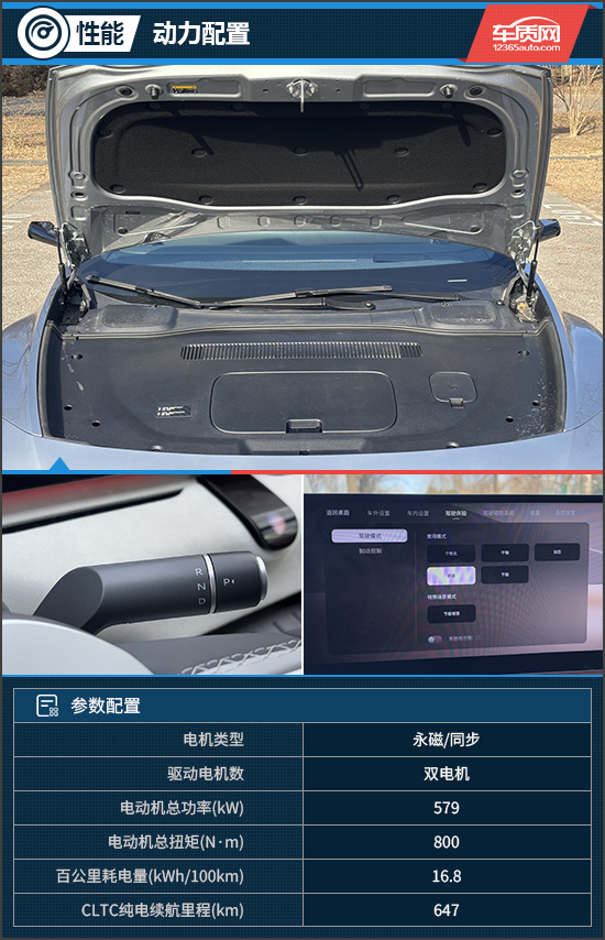 评测车基于800V高压平台打造,搭载前后双电机,电机总功率579kW,总扭矩800N·m,零百加速仅需3.4s,CLTC纯电续航里程为647km。