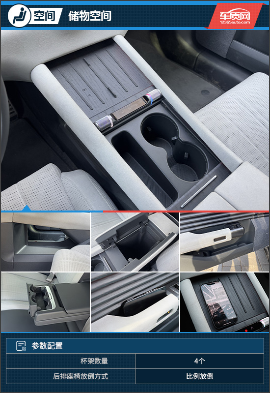 储物表现方面,评测车能够满足日常使用需求。中控台前方设置两个手机置物板,其中左侧支持无线充电;其后方提供带限位器的双杯架及小型储物槽,并配有盖板,私密性更佳。下方还预留了容积可观的镂空储物空间,车门把手采用封底式设计,便于放置随身物品。稍显遗憾的是,评测车并未配备副驾手套箱,储物习惯上需稍作改变。