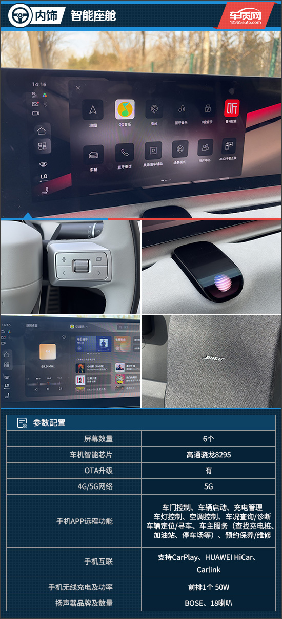 评测车搭载了59英寸Mini-LED 4K贯穿式超清广域屏,其显示效果细腻,能为前排乘员带来直观清晰的内容呈现。车机内置高通骁龙8295芯片,并引入由火山引擎与科大讯飞双擎加持的奥迪助手,不仅支持四区域语音识别,还可通过仪表台中央的触控板切换多种个性形象,无论是系统操作还是人机交互,均可带来丝滑流畅且极为人性化的体验。另外,评测车还标配带有18个扬声器的BOSE音响,可带来沉浸式的听觉享受。