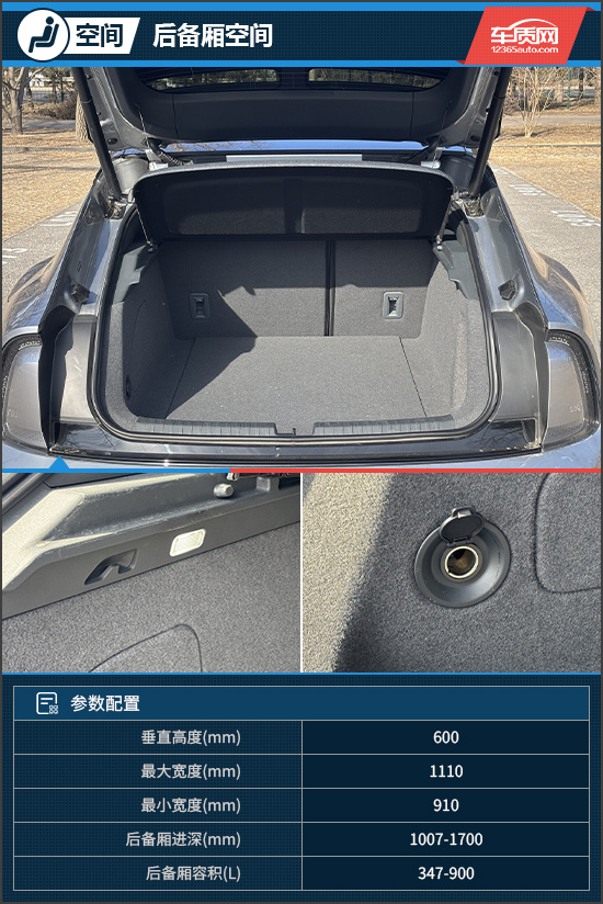 后备厢内部空间十分规整,常规状态下容积为347L,后排座椅放倒后,实测可扩展至900L,装载能力进一步提升。除此之外,内部还配备了12V电源、隐藏式挂钩等实用配置,充分体现了“瓦罐”车型的优势。