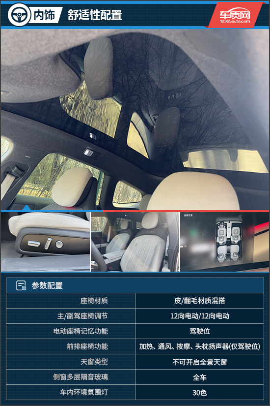 舒适性配置方面,评测车配备不可开启全景天窗,并支持智能调光功能,在保证座舱通透感的同时兼顾防晒需求,体验更显高级。座椅采用9层复合结构打造,能够为身体提供良好的支撑性与贴合感。配置层面,前排座椅支持加热、通风、按摩和头枕扬声器(仅驾驶位),方向盘与后排座椅同样提供加热,对寒冷季节用车十分友好。